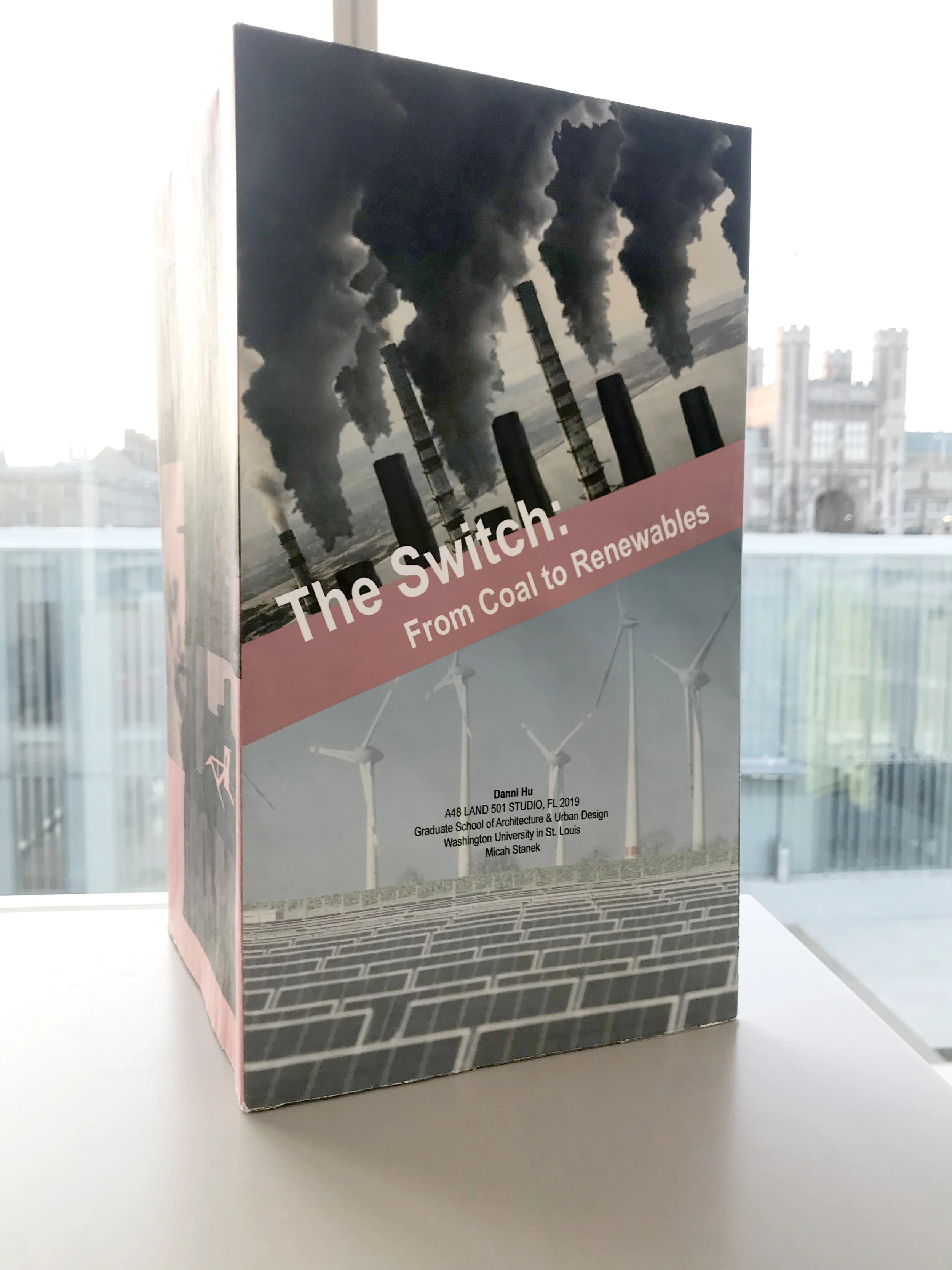 Danni’s project visualizes the legacy of coal pollution and ash deposits around 3 nearby plants. The project maps the region in scale, but offers human scale through planting and markers as a further reminder of one of the environmental costs of our coal-burning legacy. The floodplain topography is made of recycled concrete and the coal pollution markers are made of recycled utility poles, become less necessary as energy becomes more generated onsite, as this project does through solar energy collection on a nearby facade.