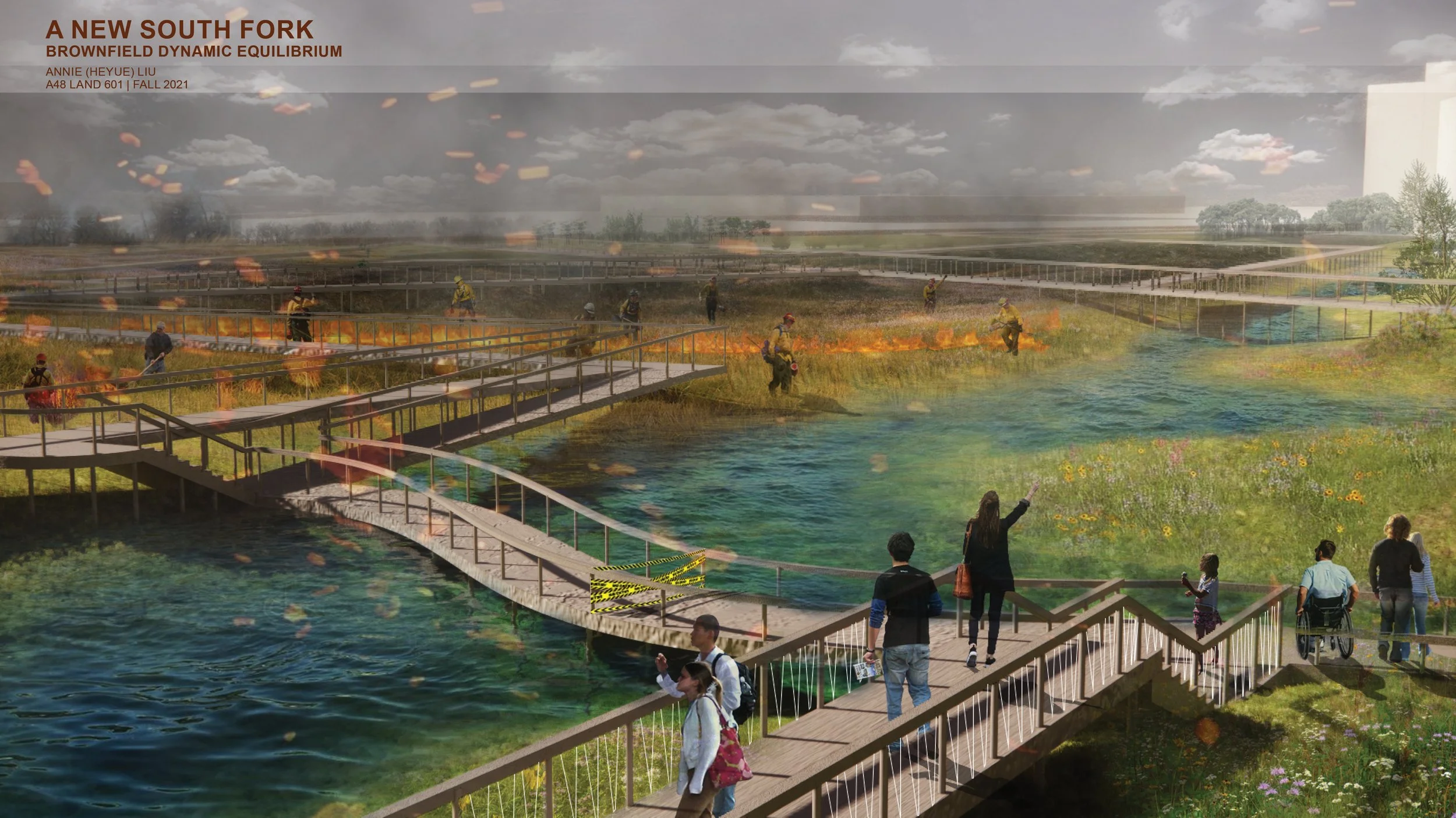 Heyue Liu’s project uses the rainy season floods to imitate the reverse of upstreaming the Chicago River, as the government reversed the Chicago River to ensure the purity of their drinking water in Lake Michigan. The imitated mechanism turns the water on the two parts of the site into a microcosm of history, echoing the river history museum transformed from an old factory on site. The project is also ambitiously committed to improving flood controls by adding a retention pond on the brownfield at the source. The renovated site connects the residential area to the new South Fork and Bubbly Creek, encouraging more public engagement.